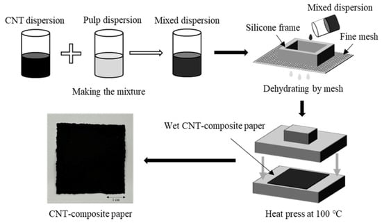 CNT composite paper can be constructed in the following way based on the traditional Japanese washi method, as described in our previous study []. Figure 3 shows the construction process of CNT composite paper.