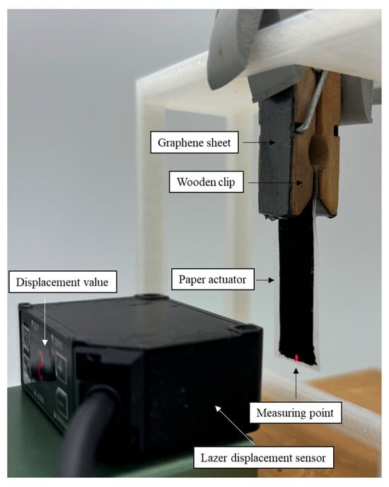 Figure 7 shows the experimental setup for measuring the bending motion of our paper actuator. A wooden clip covering a graphene sheet is mounted on the edge of the actuator to apply the voltage and prevent the ionic liquid from leaking out of the actuator. When a rectangular wave voltage is applied to the actuator with an arbitrary function generator (FGX-2220, TEXIO TECHNOLOGY CORPORATION, Yokohama, Japan), the bending motion is measured with a laser displacement sensor (CD22-15V, OPTEX FA CO., LTD., Kyoto, Japan).