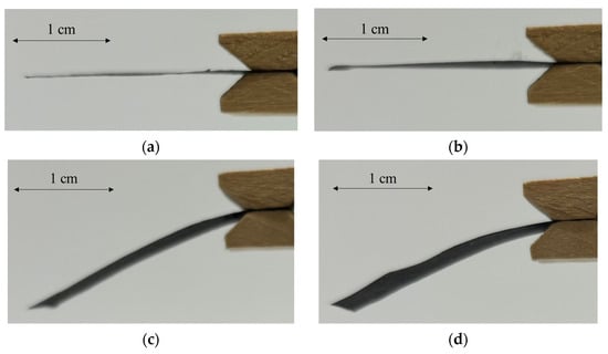 Difference in deflection depending on the amount of CNTs: (a) 30 mg, (b) 20 mg, (c) 10 mg, and (d) 5 mg.
