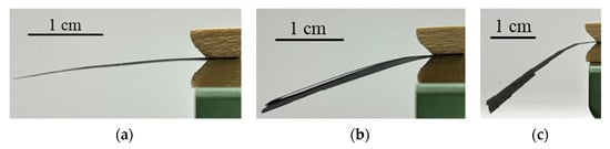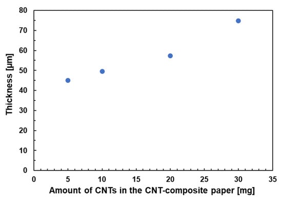 Generally, to soften paper, it is necessary to reduce the amount of pulp in the paper; however, in the case of CNT composite paper, reducing the pulp would cause problems such as the paper not being uniform or a piece of paper being missing in the configuration of CNT composite paper, making it impossible to make perfect CNT composite paper. Therefore, we attempted to reduce the amount of CNTs in the composite paper. It is known that CNTs in the composite paper are thought to have a role in connecting fiber to fiber [,,], and it was confirmed that reducing the amount of CNTs effectively made the composite paper softer than the previous one in our preparatory experiments. To confirm the change in the composite paper in response to the change in the amount of CNTs contained, four samples of CNT composite paper were made and the softness of them was measured. In measuring the softness, one end of CNT composite paper was fixed with a clip to check the degree of deflection. In addition, it was generally known that the softness of the paper was affected by the thickness. We therefore also measured the thickness of the CNT composite papers with a digital outside micrometer (MCD130-25, Niigata Seiki Co., Ltd., Niigata, Japan). Figure 8 and Figure 9 show the degree of deflection and thickness of the four prepared samples of CNT composite paper. As shown in Figure 8, there was little change in (a) and (b), while there was a large deflection in (c) and (d). As shown in Figure 9, the thickness of the CNT composite papers was proportional to the amount of CNTs.