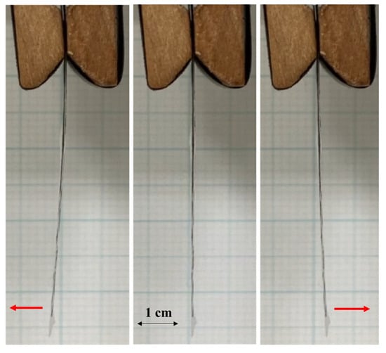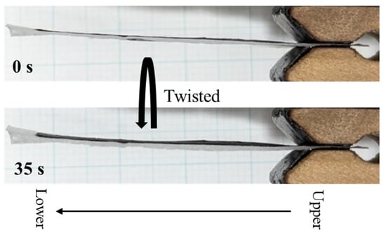 Figure 13 shows the processed CNT composite papers and Figure 14 shows them clipped at the edge to determine the degree to which the sample deflects under gravity. It was found that CNT composite paper softens after the cutting processes. Using this sample, the response of the actuator when a voltage with an amplitude of ±3 V and a frequency of 10 mHz was given as the input is shown in Figure 15. The sample with a vertical incision shown in Figure 15a shows that the maximum displacement was 4 mm, which is greater than that without a vertical incision; therefore, it was confirmed that a vertical incision was effective for the bending motion. On the other hand, in the sample with a horizontal incision shown in Figure 15b, the maximum displacement was 1 mm, which did not differ much from the case without horizontal incision; however, the actuator was then found to perform not only a bending motion but also a twisting motion, as shown in Figure 16. This is thought to be due to the fact that the horizontal incision induced the electrode layer to deform from a two-dimensional direction to a three-dimensional direction, changing the bending motion into a twisting motion. Although the details were still under investigation, we presumed that the twisting motion was affected by the specific movement of the anions and cations in the ionic liquid, which was triggered by the specific slit patterns. We believe that the slits probably exhibit eye-pattern-like shape-changing behavior because of ion movement, which is the cause of the three-dimensional motion. Indeed, paper and sheet-like materials with such slits are known to easily form three-dimensional structures []. As a result, the twisting motion in addition to the bending motion was found to be feasible by incorporating the Kirigami technique into the CNT composite papers.