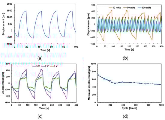 Figure 11 shows the measured displacement, frequency response, response to voltage, and displacement duration when rectangular wave voltage was applied to our modified paper actuator. Figure 11a shows the displacement characteristic of the actuator under a rectangular wave input voltage of ±3 V and frequency of 40 mHz. The maximum displacement was 2 mm, which is 20 times greater than that of the previous actuator. Figure 11b shows the response of the actuator when the frequency of the input is changed under a rectangular wave input voltage of ±3 V. As a result, the displacement of the actuator followed the input frequency. In other words, when high-frequency rectangular wave voltage was applied to the actuator, the bending motion could not reach its maximum displacement; therefore, the displacement became smaller, resulting in a small oscillating motion. Figure 11c shows the motion of the actuator when the input frequency was fixed at 10 mHz and the input voltage was varied. It was found that the displacement of the actuator followed the input voltage; in other words, the ions in the actuator were moving under the influence of the input voltage. Figure 11d shows the motion duration characteristics of the actuator under a rectangular wave input voltage of ±3 V and a frequency of 100 mHz. It was found that the bending motion of the actuator continued for at least 1000 cycles. It has also been confirmed that the bending motion of the actuator continued for at least 2 days. The results show that the actuator works like other actuators; however, a gradual decrease in displacement was also observed. We consider that this was because the ionic liquid in the paper actuator moved downward via gravity, reducing the ions that affect the bending motion.