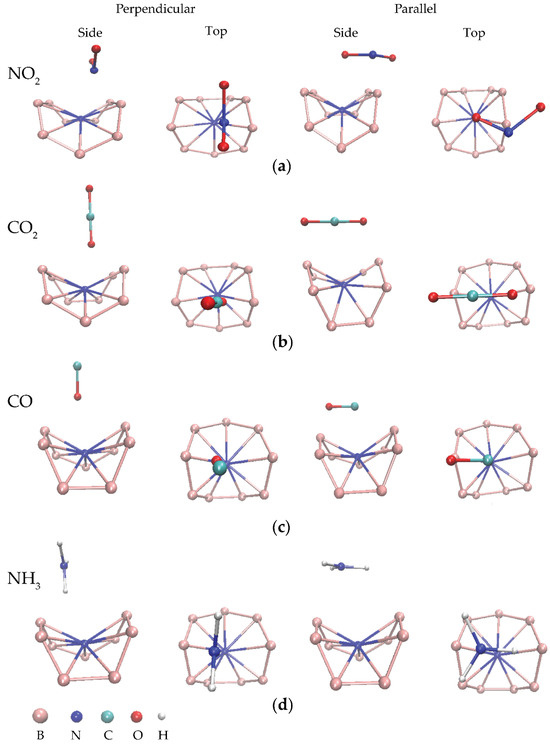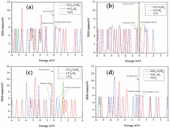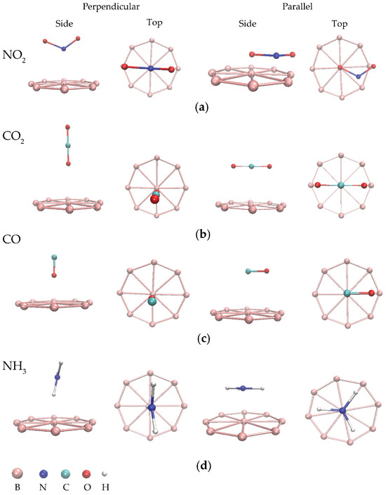 - Huang, C.S.; Murat, A.; Babar, V.; Montes, E.; Schwingenschlögl, U. Adsorption of the gas molecules NH3, NO, NO2, and CO on borophene. J. Phys. Chem. C 2018, 122, 14665–14670. [Google Scholar] [CrossRef]