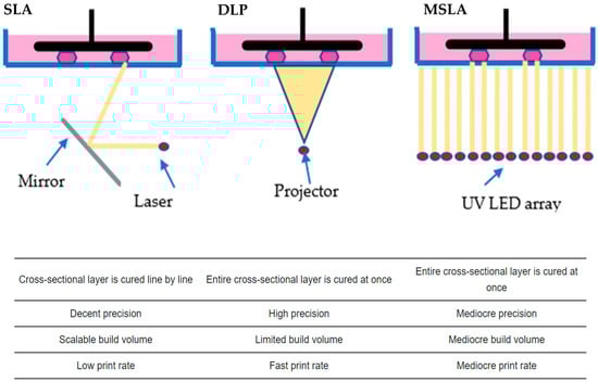 Comparison of different 3D printing techniques, including SLA, DLP and MSLA, with their common features and differences [15].