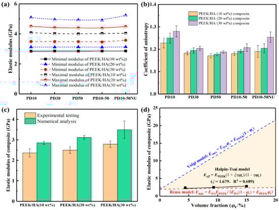 (a) The minimum and maximum elastic moduli for different material formulations of PEEK composites; (b) the coefficient of anisotropy compared to different composite formulations; (c) data comparison with respect to elastic modulus between experimental data and numerical results for different composite formulations and (d) Halpin–Tsai model for effective elastic moduli of composite materials [52].