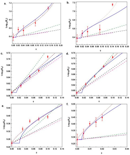 Young’s modulus versus theoretical prediction of (a) polyolefin/carbon black composites, (b) polyolefin/fumed silica composites, (c) PEEK/Al2O3 composites, (d) PEEK/SiO2 composites, (e) PTMHMTA/TiO2 composites and (f) P(MMA-MTC)/SiO2 composites. Red squares denote experimental results. Equation (1), (solid blue line), Ji model (brown dashed line), Guth–Smallwood–Einstein model (pink dashed line), Kerner model (green dashed line) and Halpin– Tsai model (black dashed line) [66].