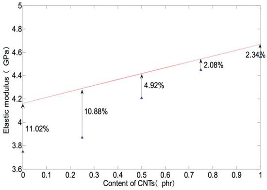Experimental and theoretical comparison showing increasing errors for elastic modulus with decreasing CNT content [68].
