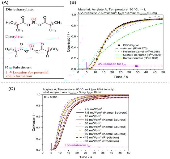 The relationship between UV intensity, temperature, and curing kinetics of acrylate A. (A) a chemical structure of dimethacrylates and diacrylates used as key building blocks in acrylate A and acrylate B, and (B) curve-fitting results of various kinetic models used to describe the curing reaction of acrylate A under a UV intensity of 7.5 mW/cm2 at the constant temperature of 30 °C (Fit quality is indicated by the coefficient of determination), and (C) kinetic predictions for acrylate A at 90 °C under UV intensities of 40 and 90 mW/cm2, based on the enhanced Kamal–Sourour equation in comparison with those predictions with actual UV-DSC measurements [83].