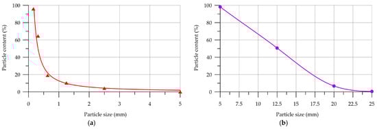 The fineness modulus of the quartz sand was 1.94 (Figure 1a). The grain size of crushed stone was limited from 5 to 25 mm (fraction over 5 to 20 mm) (Figure 1b).
