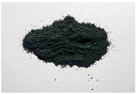 Banana leaf ash was used as a modifying additive, replacing part of the cement. The ash was produced in a laboratory setting by burning dry banana leaves in a laboratory oven. Banana leaves were exposed for 60 min to temperatures of approximately 600 °C. After combustion, the ash was sifted through a 0.16 mm sieve to remove large particles. The prepared ash was further crushed by grinding in an Activator-4M planetary ball mill at 400 rpm for 60 min. Then the crushed ash was sifted through a 0.08 mm sieve and part of the banana leaf ash that passed through the sieve was used as an additive. The appearance of the resulting BLA additive is illustrated in Figure 2. Figure 3 and Figure 4, along with Table 4, showcase the key properties of BLA.