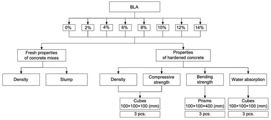 To assess the impact of BLA on concrete properties and determine the ideal dosage, concrete mixtures were formulated and documented in Table 5. Figure 5 illustrates the complete program of experimental studies.