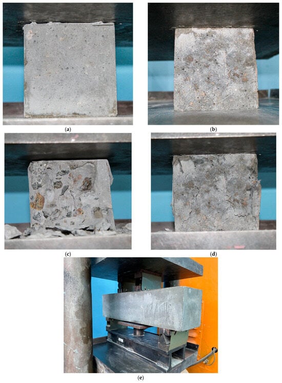 Determination of the compressive strength (a–d) and flexural strength (e) of concrete samples: (a,c) control composition before and after failure, respectively; (b,d) composition with 6% BLA before and after destruction, respectively.
