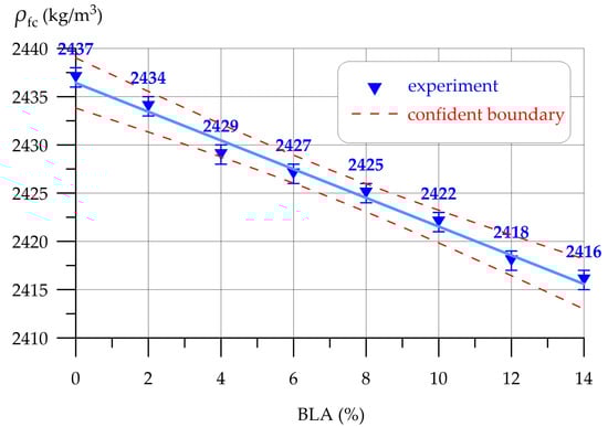 Fresh concrete density (ρfc) data obtained experimentally are well approximated by a linear dependence on the BLA proportion (x in the regression equation)