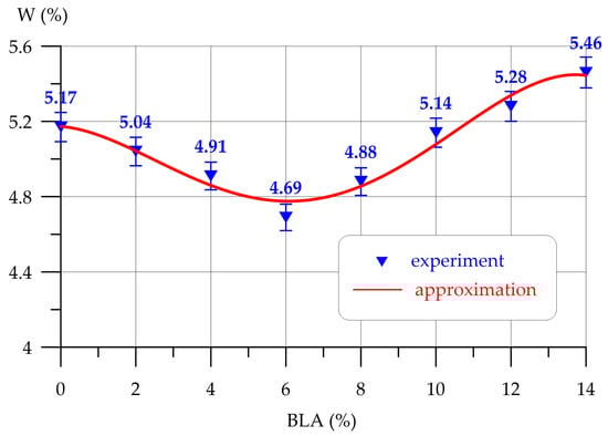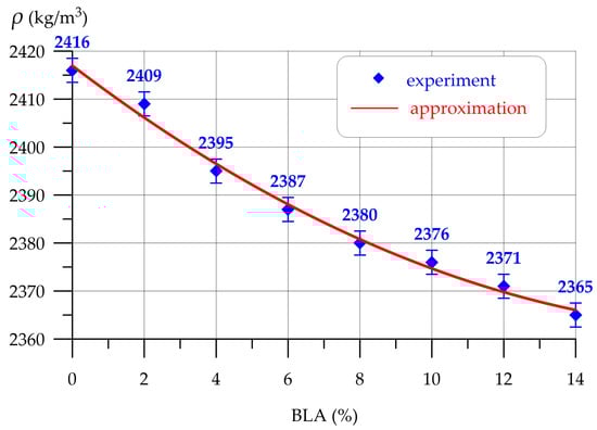 Figure 9, Figure 10 and Figure 11 show the properties of BLA-modified concrete. Figure 9 shows the dependence of the composite density (ρ) on the amount of BLA additive.