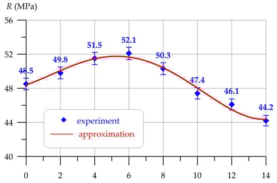 Concrete compressive strength (R) data, obtained experimentally in accordance with the methodology in Section 2, have a pronounced nonlinear dependence on the BLA proportion (x in the regression equation) and are well approximated by a 4th degree polynomial