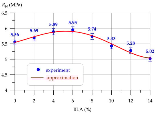 The concrete flexural strength (Rbt) data, obtained experimentally in accordance with the methodology in Section 2, also has a pronounced nonlinear dependence on the BLA proportion (x in the regression equation) and is well-approximated by a 4th degree polynomial