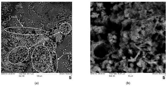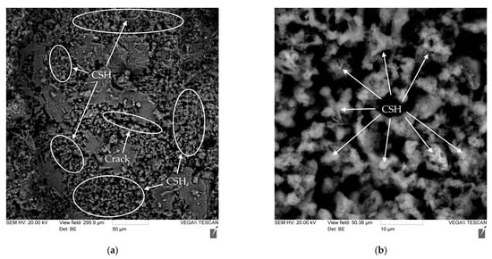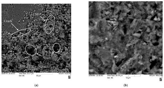 The analysis of concrete structure was conducted by employing a 20 kV accelerating voltage electron microscope VEGA II LMU (Tescan, Brno, Czech Republic). The acquisition of all the images was performed through reflected electrons (BE), wherein phases containing higher average atomic weight are portrayed in lighter shades. A carbon coating is sprayed onto the surface.