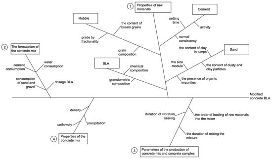 - loading of raw materials into the concrete mixing plant BL-10 (ZZBO, Zlatoust, Russia) in the following sequence: cement, sand, BLA and water with a plasticizing additive dissolved in it; mixing this mixture until a homogeneous consistency, introducing crushed stone and additional mixing until the finished concrete mixture is obtained;