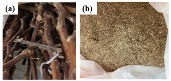 (a) Photographs of grapevines and (b) crushed and sieved grapevine powder.