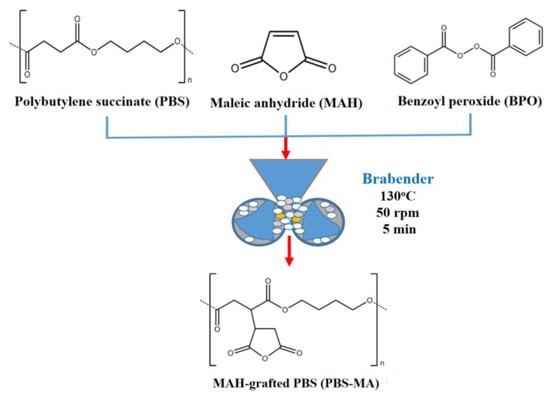 The procedure based on Shih et al. [15] 40 g of PBS and 4 g of MAH were pre-melted; subsequently, 0.5 g of benzoyl peroxide (BPO) was added in a counter-rotating internal mixer (Brabender PL2000, Duisburg, Germany) at 130 °C with a rotation speed of 50 rpm for 5 min. In order to remove the excess MAH, this obtained product was mixed with 200 mL of xylene in a three-neck bottle and refluxed at 85 °C for two hours. Afterward, the mixture was poured into acetone and rested for 40 min to obtain the refined maleic anhydride-grafted polybutylene succinate (PBS-MA). The reaction of maleic anhydride-grafted PBS was shown as Figure 2. The average grafting ratio (GMAH, %) of MAH onto PBS was determined to be 7.76% using the acid–base titration method [15]. The calculation method is shown in Equation (1):