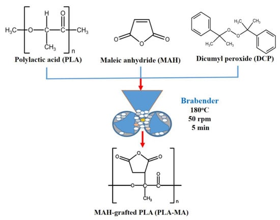An amount of 40 g of PLA and 4 g of MAH were pre-melted; subsequently, 0.56 g of dicumyl peroxide (DCP) was added in a counter-rotating internal mixer (Brabender PL2000, Duisburg, Germany) at 180 °C with a rotation speed of 50 rpm for 5 min. In order to remove the excess MAH, this obtained product was mixed with 200 mL of dichloromethane in a three-neck bottle, refluxed at 85 °C until completely dissolved, and precipitated in excess anhydrous ethanol to obtain the refined maleic anhydride-grafted polylactic acid (PLA-MA). The reaction of maleic anhydride-grafted PLA is shown in Figure 3. The average grafting ratio (GMAH, %) of MAH onto PLA was determined to be 4.02% using the acid–base titration method, as shown in Equations (2) and (3) [35].