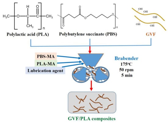 The PLA, PBS, PBS-MA, PLA-MA, lubrication agent, and GVF were dried in an oven at 60 °C to achieve a moisture content of less than 1.0 wt%. They were then combined according to the formulation (wt%) outlined in Table 1 using a counter-rotating internal mixer (Brabender PL2000, Duisburg, Germany) at 175 °C and 50 rpm for 5 min, as depicted in Figure 4. The design of the formulation in Table 1 was based on the following factors: (1) using 3 or 5 wt% of PBS to reinforce the toughness of PLA; (2) the content of GVF ranged from 10 to 50 wt%, with the expected content being over 25 wt%; (3) PBS-MA and PLA-MA were added to improve the adhesion between the polymer and GVF; and (4) a lubrication agent was added to reduce viscosity and improve the dispersion of GVF in the polymer matrix.
