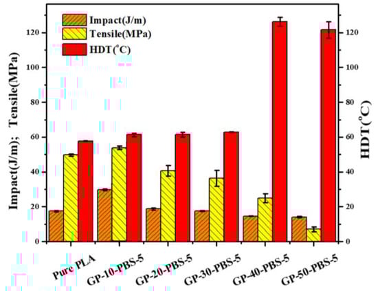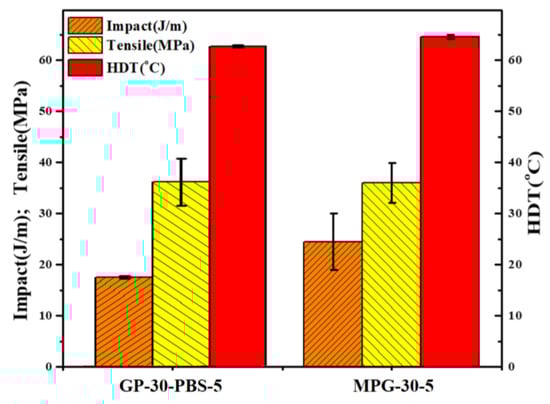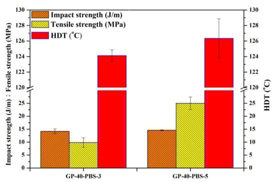 As illustrated in Table 2 and Figure 5, the impact strength, tensile strength, and heat deflection temperature (HDT) of the sample containing 5% PBS and 40% GVF (GP-40-PBS-5), with values of 14.61 J/m, 24.99 MPa, and 126.35 °C, respectively, were higher than those of the sample containing 3% PBS and 40% GVF (GP-40-PBS-3), which had values of 14.19 J/m, 9.85 MPa, and 124.13 °C. Therefore, the subsequent formulation will incorporate 5% PBS into the sample.