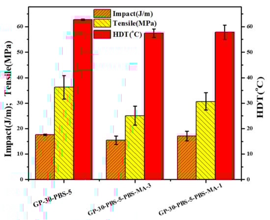 Table 2 and Figure 7 illustrate the impact of incorporating 3% or 1% PBS-MA on the properties of GP-30-PBS-5. The addition of 3% or 1% PBS-MA led to a reduction in the tensile strengths of the samples, dropping from 36.24 MPa for GP-30-PBS-5 to 25.03 MPa and 30.66 MPa, respectively. Furthermore, there was a decrease in the HDT, from 62.80 °C to 57.78 °C and 57.49 °C, and in the impact strength, from 17.54 J/m to 15.40 J/m and 17.07 J/m, respectively. These findings indicate that PBS-MA did not enhance the interfacial adhesion between GVF and PLA.