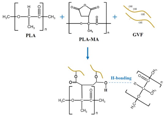 Building upon GP-30-PBS-5, 3% PLA-MA (MPG-30-5) was incorporated as a compatibilizer to enhance the mechanical properties of the composite. According to Table 2 and Figure 8, the addition of PLA-MA resulted in no significant change in tensile strength (36.24 and 36.00 MPa). However, there were notable improvements in impact strength and HDT of GP-30-PBS-5, increasing from 17.54 J/m and 62.80 °C to 24.48 J/m and 64.60 °C, respectively. These findings suggest that PLA-MA improves the interfacial adhesion between the GVF and the polymer matrix more effectively than PBS-MA does. The interactions among PLA, PLA-MA, and GVF are depicted in Figure 9.