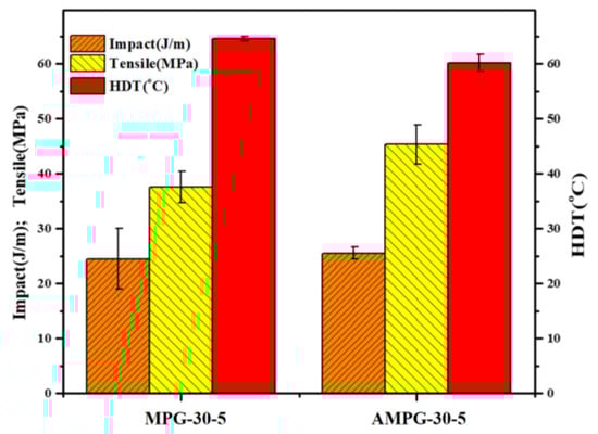 Even though the addition of PLA-MA (MPG-30-5) improved the impact strength and HDT of GP-30-PBS-5, it did not enhance the tensile strength of the composite. It was discovered that while the incorporation of PLA-MA boosted compatibility between GVF and PLA, it also increased the viscosity. This higher viscosity led to an uneven dispersion of GVF, thus hindering a significant increase in tensile strength. Consequently, a lubrication agent was introduced to the MPG-30-5 composite to reduce the friction between the matrix and additives, and to lower the material’s viscosity. Table 2 and Figure 10 showed that the impact and tensile strengths of the lubrication agent-containing composite (AMPG-30-5) increased from 24.48 J/m and 36.00 MPa to 25.52 J/m and 45.30 MPa, respectively. The results indicate that the impact of the lubrication agent on the increase in tensile strength is more pronounced than its effect on impact strength. This observation suggests that the uniform dispersion of the filler within the matrix is crucial in determining the tensile strength [15]. However, the HDT decreased due to the lubricating effect of the lubrication agent.