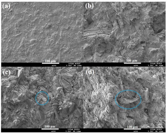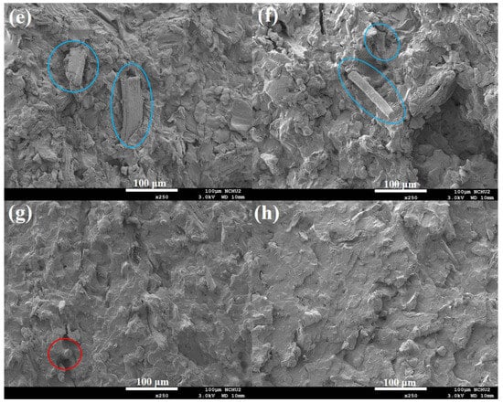 The SEM images of the fracture surfaces of PLA and its composites are presented in Figure 11. These observations were made to confirm the earlier explanation of the rheological data based on the phenomena of compatibility and viscosity in the GVF/PLA composites. A smooth surface was observed for pristine PLA (Figure 11a). The image of GP-10-PBS-5 (Figure 11b), representing the composite with 10% GVF, shows that the GVF fibers were well-dispersed within the polymer matrix without forming agglomerated structures. In contrast, Figure 11c shows agglomerated and exposed fibers (highlighted by the blue circle) that were not fully covered by the PLA matrix in the GP-30-PBS-5 composite. Figure 11d,e display the surfaces of composites containing 40% GVF with 5% and 3% PBS (GP-40-PBS-5 and GP-40-PBS-3, respectively). Both images reveal exposed fibers (highlighted by blue circles), but GP-40-PBS-3 had more exposed fibers than GP-40-PBS-5, suggesting that 5% PBS provides better coverage. This observation aligns with the mechanical property analysis. In Figure 11f, it is evident that the addition of PBS-MA in GP-30-PBS-5-PBS-MA-3 did not improve the compatibility between GVF and PLA, as exposed fibers (marked by blue circles) are still visible. Conversely, Figure 11g shows a densely knitted texture (highlighted by the red circle), indicating that the addition of PLA-MA in MPG-30-5 improved the compatibility between the GVF and the PLA matrix, enhancing adhesion. Furthermore, the smoother texture and absence of exposed fibers in AMPG-30-5 (Figure 11h) suggest that the addition of a lubricating agent reduced the viscosity of the composite, leading to a more uniform dispersion and coverage of GVF within the PLA matrix. These microscopic observations are consistent with the results from the mechanical property and MFI analyses.