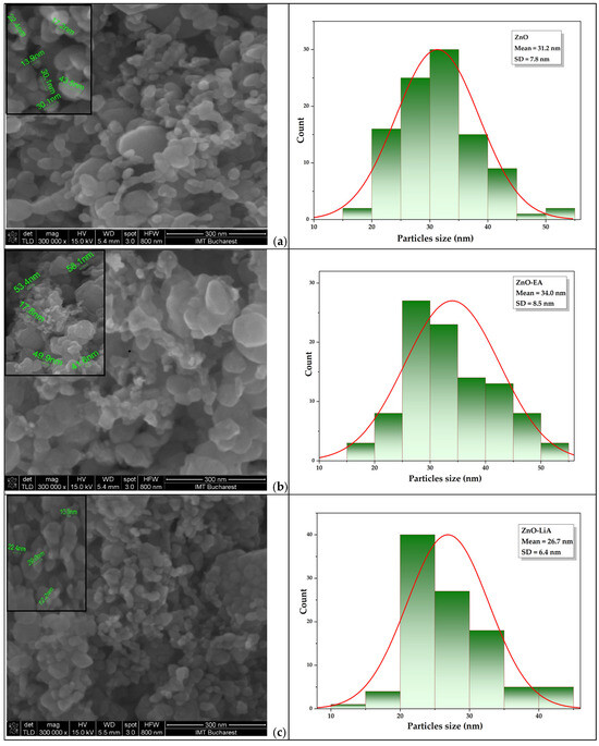 For ZnO samples with fatty acids (Figure 5b–e), the increase in the average particle size depends on the types of capping agents. Using unsaturated acids (EA and LiA), the ZnO particles have sizes in the range of 10–50 nm. For samples with saturated acids (SA and LA), the size varies between 16 and55 nm. Also, the SEM images for the synthesized samples reveal that the modified ZnO nanoparticles were interconnected to form hierarchical structures of nanoparticles crowded with a large number of nanospheres and an asymmetrical arrangement. The particle size histogram of ZnO samples modified with fatty acids has sizes in the range of 26.7–41.7 nm.