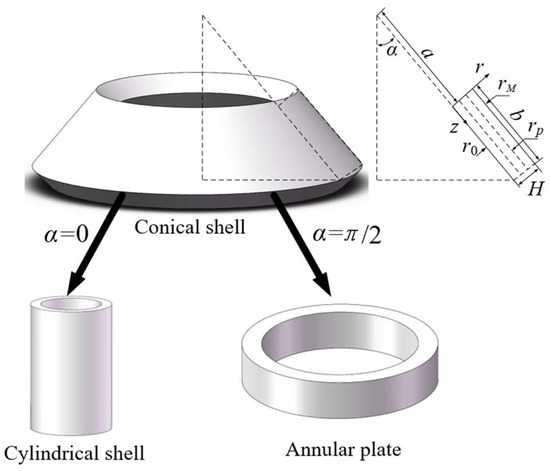 To prevent the initiation and propagation of defects in the multilayered plate/shell model design, the vibrational frequencies and stress distributions of the multilayered cylindrical shells, truncated conical shells, and annular plates need to be accurately predicted and evaluated [7,8,9]. Ten different shell theories were adopted to derive the semi-analysis solutions for cylindrical shells, and numerical examples indicated that the results based on Soedel and Kennard-Simplified theories were more accurate than those based on other theories [10]. Żur [11] presented the free vibration analysis of functionally graded circular plates with discrete elements by using the Neumann series method. Based on the discrete singular convolution method and differential quadrature method, Ersoy et al. [12] obtained the exact solutions for truncated conical shells, circular cylindrical shells, and annular plates. Eshaghi et al. [13] developed a numerical model of circular/annular plates under variable magnetic flux by using the Ritz method, from which the dynamic characteristics of the structure were obtained. Furthermore, they verified the effectiveness of this theoretical model by experimenting. The free vibration problems of determining the field variables which occurred in functionally graded annular plates with general boundary conditions [14,15] were derived, and the results showed that smaller gradient factors and elastic coefficients can retard the natural frequencies. Safarpour et al. [16] derived an exact solution of three-dimensional (3D) bending and frequency for functionally graded graphene-platelet-reinforced composite (FG-GPLRC) porous circular/annular plates with various boundary conditions. Meanwhile, the effects of geometric and material factors and different boundary conditions on the static and free vibration of FG-GPLRC were discussed using the theory of elasticity and differential quadrature method [17,18]. In addition, semi-analysis solutions for fiber metal annular plates with mixed boundary conditions [19] were developed to obtain the vibration frequencies. In the same way, truncated conical shells also have a wide range of engineering applications as the basic structure elements, and have attracted the attention of researchers. Kerboua and Lakis [20] obtained the free vibration analysis of discrete–continuous functionally graded circular plates via the Neumann series method. The first-order shell theory and the Sanders nonlinear kinematics equations [21] were proposed to improve the thermal and mechanical stability of functionally graded truncated conical shells.