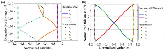 Based on a mixed formulation of solid mechanics, the state vector approach sets out-of-plane unknowns (ur, uθ, uz, wr, wθ, wz, σrr, σrθ, σrz, Hrr, Hrθ, Hrz) as basic variables, which are defined as primary variables A [33,34]. The state vector equations of the p-th layer can be established by combining the basic unknowns of the three governing equations in Equations (1)–(3), which are expressed as follows: