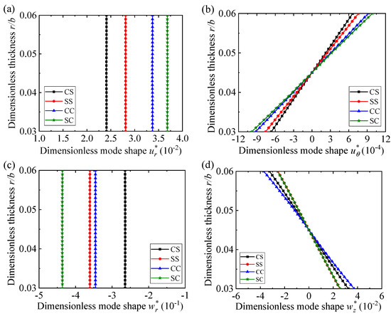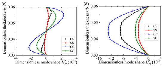 The radial coordinates of data points in the resulting graph of this section are fixed at z/b = 0.7. The ring coordinates of data points are all basic solutions, and the angle variation can be multiplied by the sine-cosine factor from Equations (5) and (6). Figure 4 shows the variations of the first-order mode shapes of the phonon and phason displacements for QC annular plates with four different boundary conditions along the r-direction. The distributions of and (Figure 4a,c) are symmetrical, but the distributions of and (Figure 4b,d) are anti-symmetrical at r/b = 0.045, so these curves are flexural mode shapes. Moreover, the values of the mode shapes for and at r/b = 0.03 and 0.06 decrease in the order of SC, CC, SS, and CS for a fixed value of h/L. In addition, it is observed that the phason mode shapes and are sensitive to the different boundary conditions.