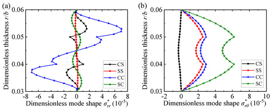 Figure 5 shows the variations of the first-order mode shapes of the phonon and phason stresses for QC annular plates with four different boundary conditions along the r-direction. The (Figure 5a) of QC annular plates with boundary conditions CS and CC experience a large slope jump at the two interfaces based on the QC linear elastic theory. In addition, increasing the phonon material properties of QC2 helps reduce this jump. The (Figure 5b) of the plates with boundary conditions CS exhibits a different response from plates with other boundary conditions. The maximal values of and (Figure 5c,d) at r/b = 0.03 and 0.06 increase in the order of SS, SC, CS, and CC for a fixed value of h/L. These features show that the clamped boundary condition increases the stiffness of the plate, resulting in changes in the frequencies and mode shapes.