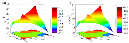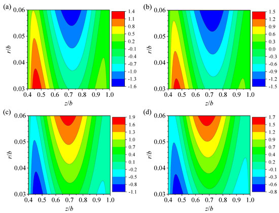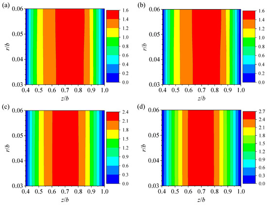 The contour plots of the dimensionless phonon displacement mode shapes and for QC truncated conical shells on the r-z plane are presented in Figure 6 and Figure 7. The distributions of (Figure 6a–d) for the QC shell are all asymmetrical at z/b = 0.7 mm and almost constant along the r-direction. The maximum value of becomes greater with the increase in α. The results in Figure 6 and Figure 7 confirm that the phonon displacement boundary conditions in Equation (27) are precisely satisfied, partially verifying the accuracy of the present methods. The distributions of (Figure 7a–d) are nonlinear, from which the first-order, second-order, and higher-order plate and shell theories are imprecise.