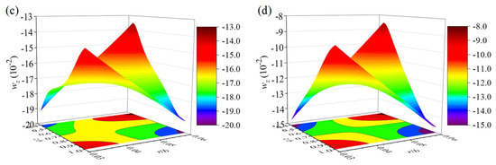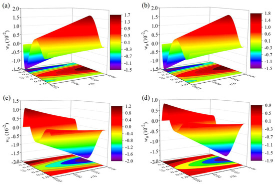 The contour plots of the phason displacement mode shape (10−3): (a) α0 = π/6, (b) α = π/6, (c) α = π/4, and (d) α = π/3.