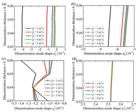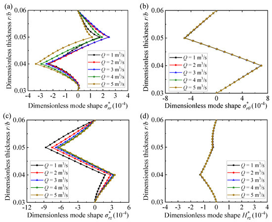 Figure 10 and Figure 11 show the variation of the first-order dimensionless displacement and stress mode shapes of QC truncated conical shells with different Q values, respectively. An increase in Q results in a decrease in the magnitude of and (Figure 10a,b) for QC shells. The decreasing of the values of the mode shapes is fast in the range of 1 m3/s ≤ Q ≤ 2 m3/s. It is noted that and are continuous across the interfaces for the classical elasticity case. However, (Figure 10c) shows different behavior, especially in the middle layers of the QC shell. experiences a slope jump at r/b = 0.04 and 0.05. In addition, Q has little effect on (Figure 10d), including , and . The maximum values of and (Figure 11a,c) occur at the interfaces between layers. Different from the distribution of , (Figure 11b) is insensitive to Q. Similarly, (Figure 11d) is as insensitive to Q as the phason displacement mode shapes. This feature shows the weak coupling between phason and velocity potential.
