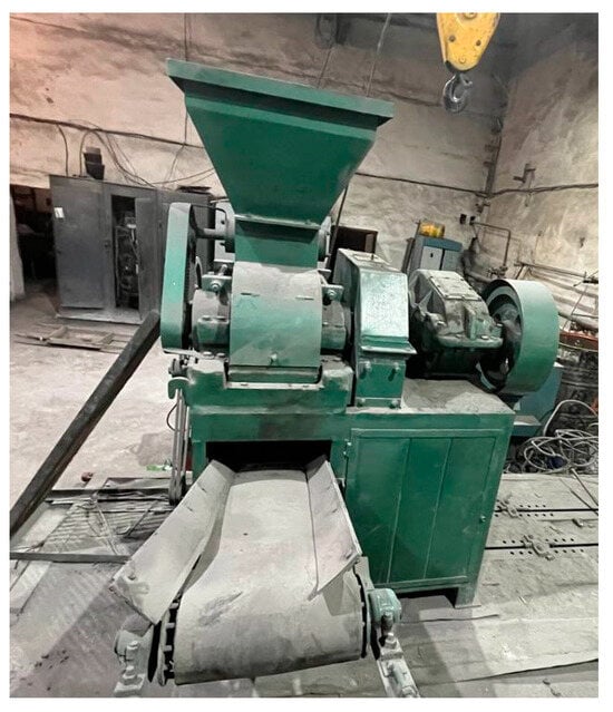 Briquettes of these compositions (Table 4) were produced on a ZZXM-4 roller briquetting press (LTD, Henan Zhongzhou Heavy Industry Technology Co., Zhongzhou, China) (Figure 1).