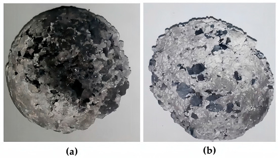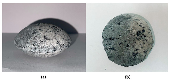 After producing pilot batches of briquettes of each composition and drying them, experiments of the briquettes heat tolerance evaluation were conducted. Figure 5 shows a photo of the briquette before the thermal shock (a) and immediately after it (b).