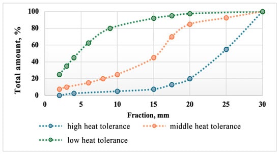 The graph shows that, with increasing briquetting force, the heat tolerance of the briquettes goes through a maximum in the range of 250–350 kgf/cm2. Simultaneously, with the increase in briquetting force, a decrease in the reactivity of the briquettes is observed. At the optimal force in terms of heat tolerance, the reactivity of the briquette is at critical values, around 40%. To explore the possibility of increasing the reactivity in combination with high heat tolerance, experiments were conducted at lower briquetting forces but with a higher degree of variability in the granulometric composition. This assumption was based on the fact that polydisperse materials typically create a denser packing during briquetting without the presence of macropores within the briquette. Due to the naturally high packing density of the particles, on the one hand, the briquetting force required to ensure high heat tolerance and mechanical strength is reduced. On the other hand, the reduction in briquetting force ensures the presence of micropores, facilitating the removal of gaseous reaction products from the briquette body.
