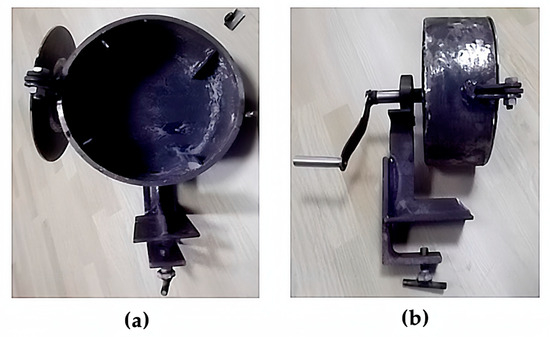 Figure 4. Drum for testing abrasion of briquettes subjected to thermal shock: (a) top view; (b) side view.