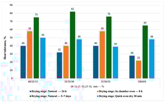 The graph shows the heat tolerance of briquettes of different fractional compositions at various stages of drying. The highest heat tolerance (82%) was achieved with natural drying for 5–7 days for briquettes with a fractional composition of 35/35/30% (0–1; 1–3; 3–5 mm). Quick drying for 30 min in an oven gave the lowest results in terms of heat tolerance for all fractional compositions. In general, longer natural drying times result in better heat tolerance.