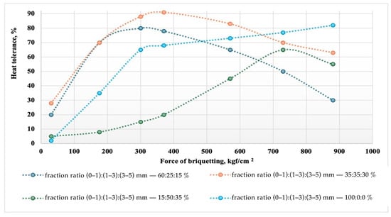 Figure 7. Dependence of the heat tolerance of briquettes on the briquetting force and their granulometric composition.
