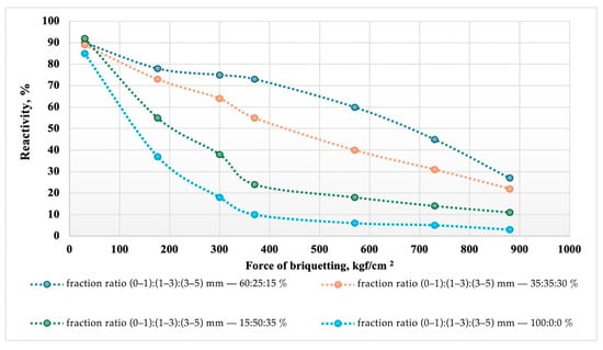 Obviously, for all studied variants of briquettes, with increasing briquetting force, the reactivity decreases. There is a direct proportional dependence of the briquette’s reactivity on the granulometric composition.