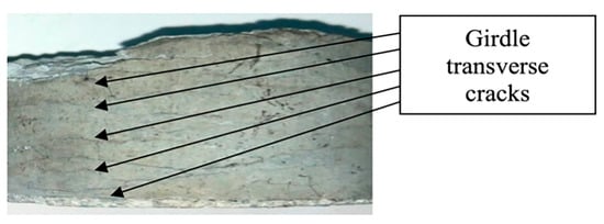 This type of briquette visually differs from briquettes made using other types of reducers, which allows it to be identified by external signs. Based on graph-analytical analysis, it was assumed that to achieve full heat tolerance of the briquette, the briquetting force should be 800–900 kgf/cm2 (80–90 MPa), which corresponds to data presented in the literature [1,2]. However, this did not happen. Briquetting at a pressure of 570 kgf/cm2 led to significant delamination of the briquette and a decrease in heat tolerance to 65%. Delamination refers to cracks developing perpendicular to the force application vector during briquetting, encircling the briquette around its perimeter. The cracks are mainly surface-level, penetrating the briquette body to a depth of 1–3 mm as shown in Figure 9.