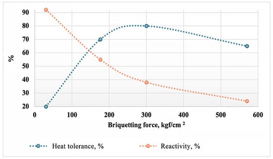 It has been established that heat tolerance depends on the specific pressing force and granulometric composition of the charge. The dependence of the heat tolerance and reactivity of the briquettes on the briquetting force is shown in Figure 10.