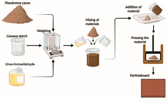 The constituents were weighed and mixed in a container before panel manufacturing, following the proportions established for each treatment. Before its use, 2% (weight/weight) ammonium chloride was added as a catalyst to the UF adhesive. Then, cocoa wood waste particles were added, and the mixture was homogenized. The material was placed in an aluminum mold measuring 300 mm × 300 mm. The mold was closed, and the mixture was pressed at 3.5 MPa at 170 °C for 8 min. After pressing, the panels were removed from the mold and conditioned for six days at 20 °C ± 2 °C and a relative humidity of 62% ± 2%. O fluxograma desenvolvido no site biorender, apresenta todas as etapas da manufatura dos painéis aglomerados (Figure 1).