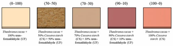 Proportions of Cassava starch (CS) and urea–formaldehyde (UF) adhesives for bonding particleboards produced with Theobroma cacao wood wastes.